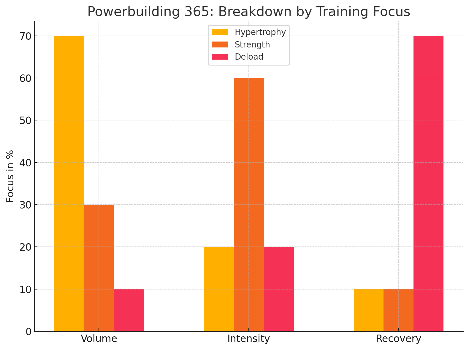 Answer: The Deload bars show minimal focus on Volume (10%) and Intensity (20%) but a significant increase in Recovery (70%), emphasizing rest and rejuvenation.