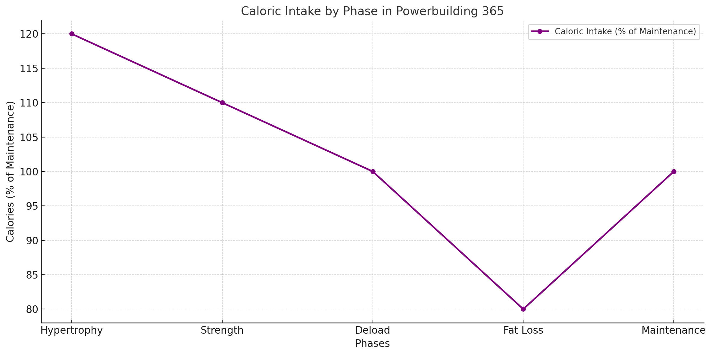 Strength Phase: Increased carbohydrates for energy during heavy lifts.