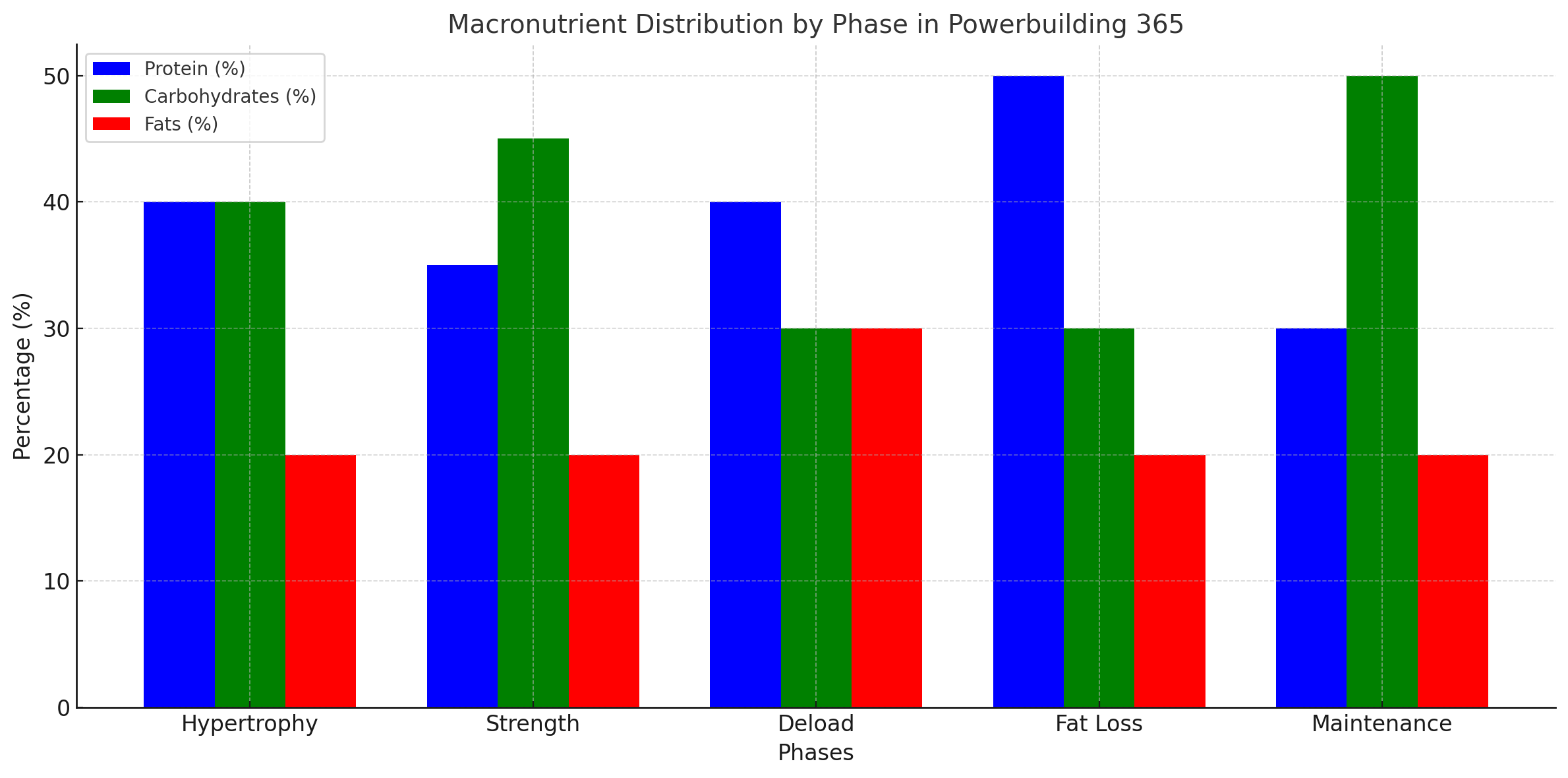 Deload Phase: Higher fats to support recovery while reducing carbohydrates.