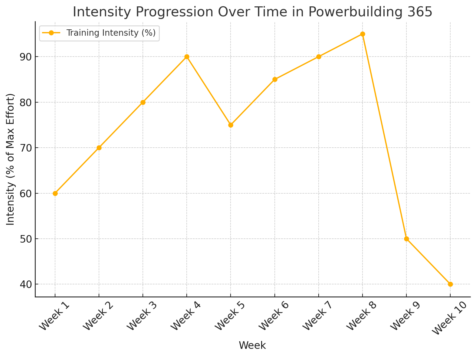 Intensity drops significantly to allow recovery and prepare for the next training cycle. This phase is critical for preventing fatigue and injuries.