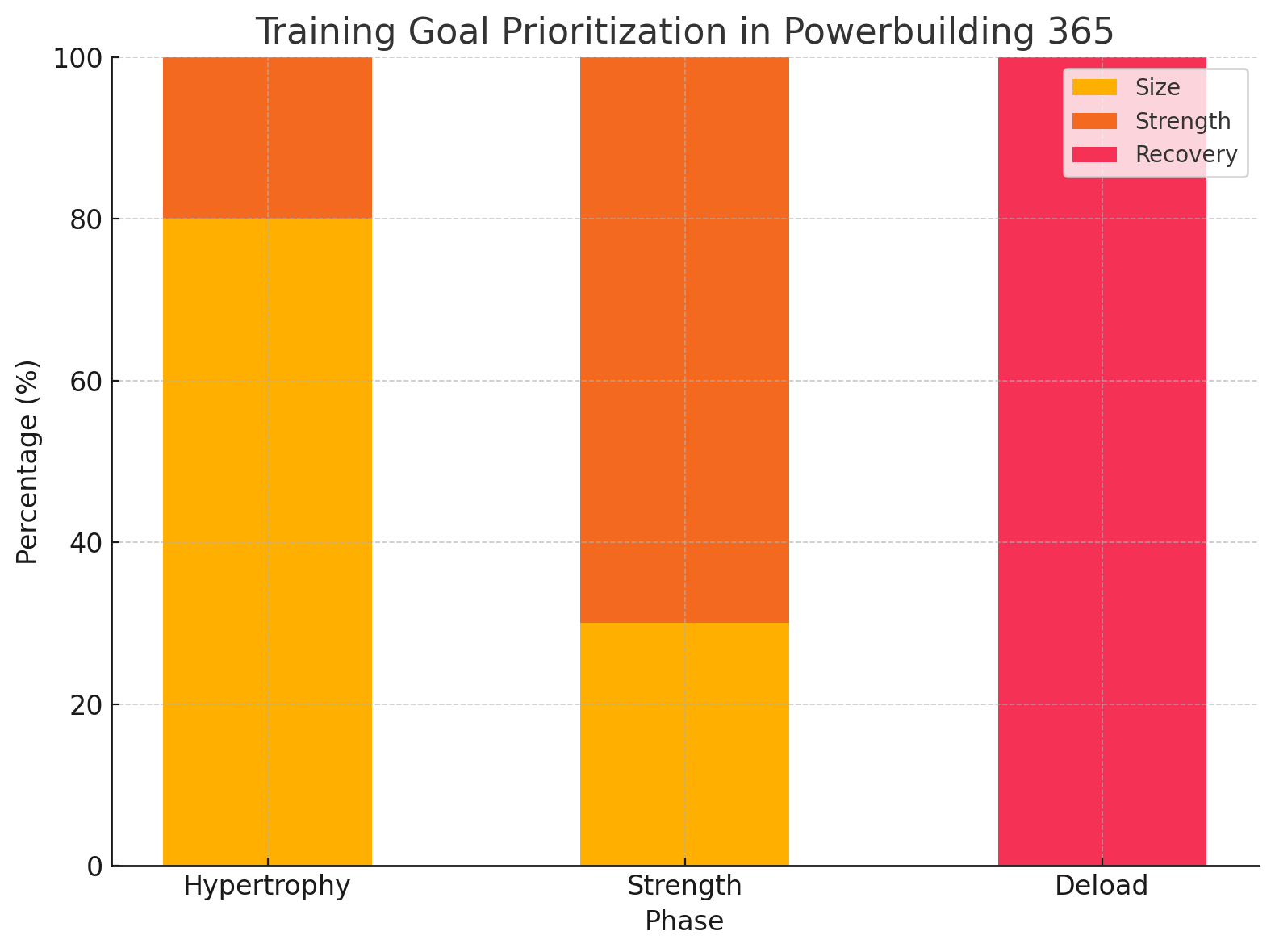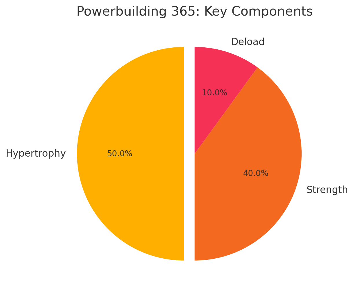 POWERBUILDING 365 is structured into three essential phases: Hypertrophy, Strength, and Deloading—designed to ensure balanced growth, power, and recovery. The chart below shows how these phases are proportionally distributed across the program.POWERBUILDING 365 is structured into three essential phases: Hypertrophy, Strength, and Deloading—designed to ensure balanced growth, power, and recovery. The chart below shows how these phases are proportionally distributed across the program.