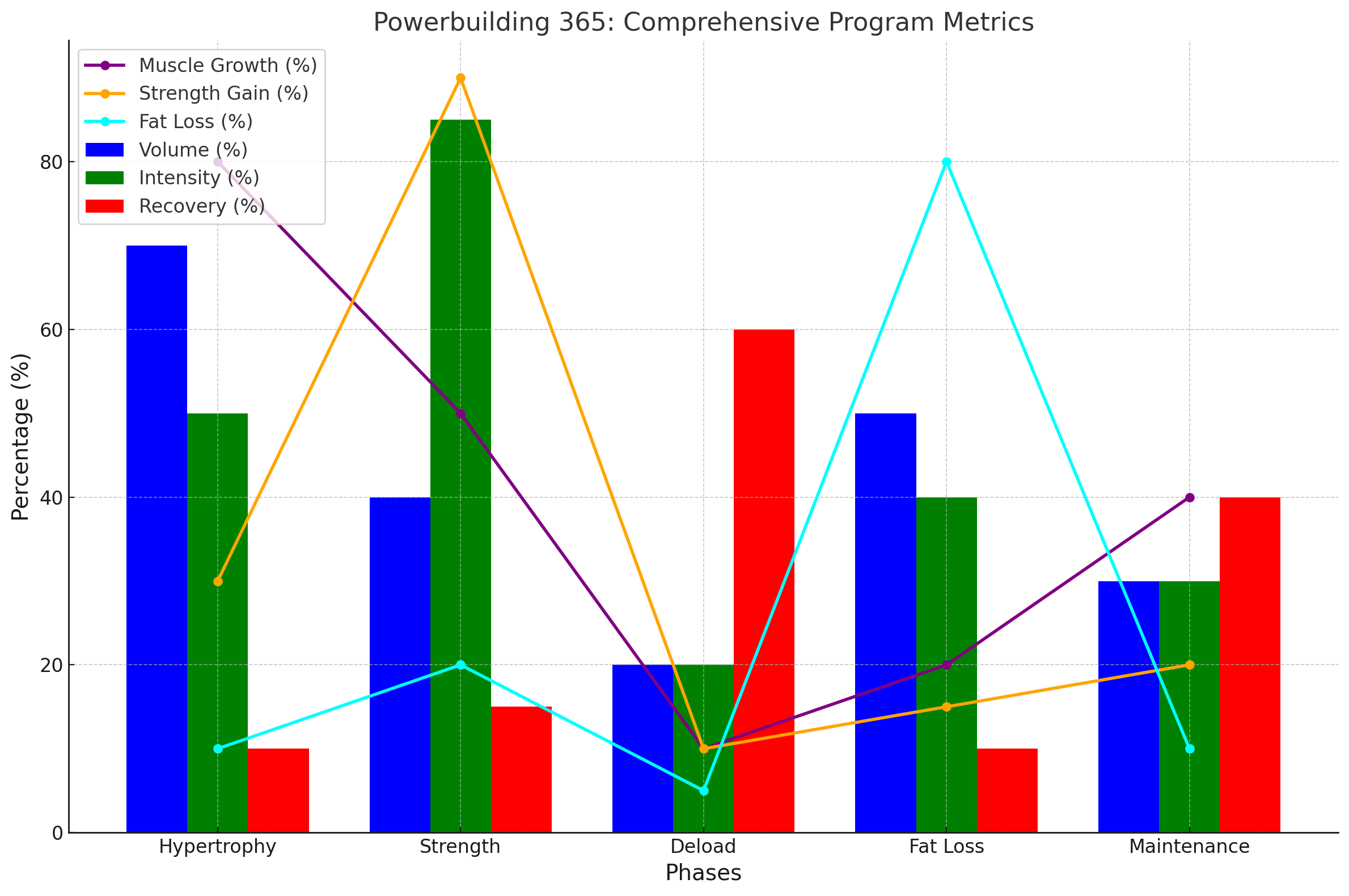Answer: The graph shows how volume, intensity, and recovery shift across phases to align with specific goals like muscle growth, strength, or fat loss. This strategic design ensures lifters achieve results efficiently while minimizing burnout.
